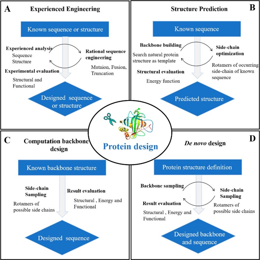 根据综述内容可知,蛋白质所具有的功能很大程度上取决于其内部空间结构,通过理性的结构设计和改造可以赋予蛋白质特殊的功能特性。目前,蛋白质的结构设计方法主要包括经验性结构设计、结构预测、计算机辅助蛋白重设计以及从头设计。其中,与经验性的蛋白结构设计相比,计算辅助设计的方法可以极大地减少实验工作量,增加成功的机会。另外,由于蛋白质折叠机制以及结构功能之间的关系十分复杂,从头设计蛋白质仍然面临巨大挑战。