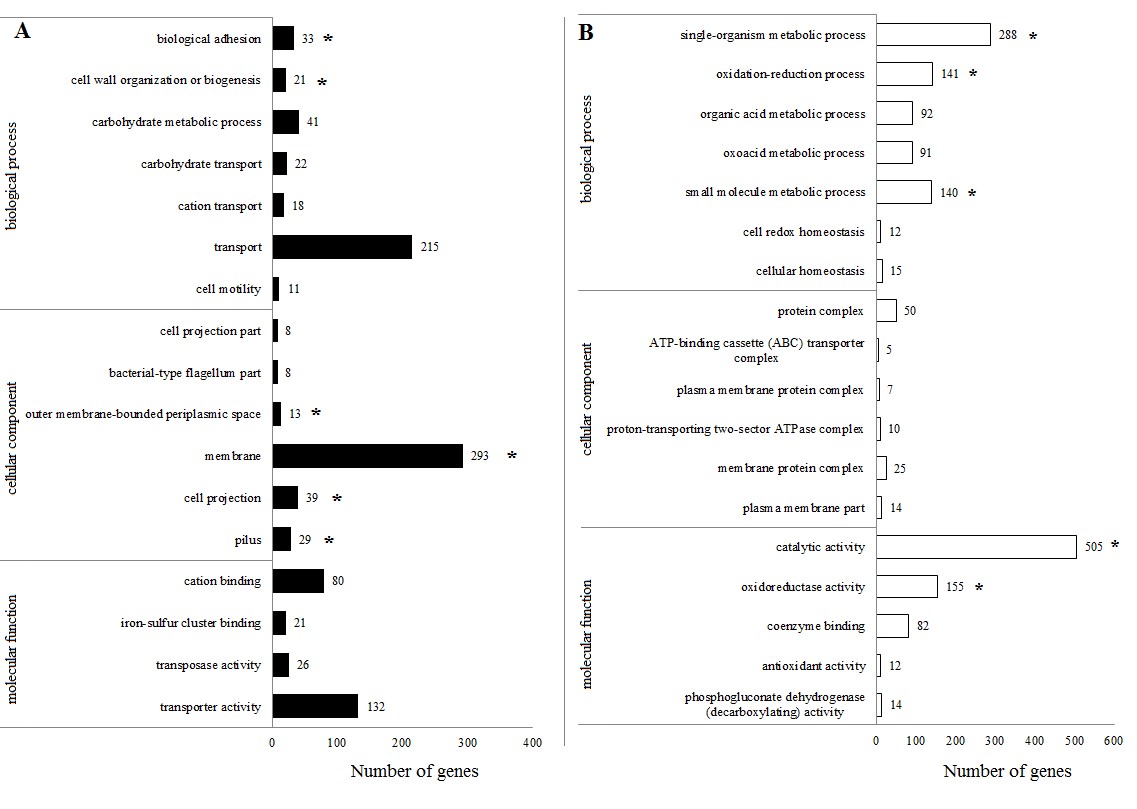 大肠杆菌O157:H7复活早期菌vs损伤菌的GO termA上调基因, B下调基因)