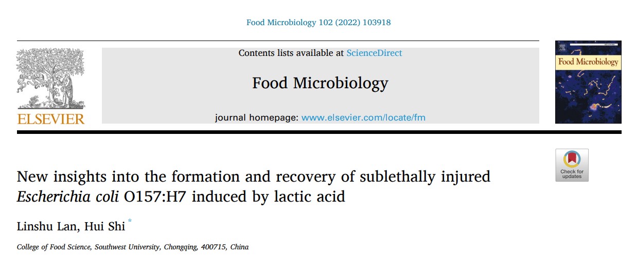 食源性致病菌在食品中以各种状态存活,反复污染难以彻底清除,是食品安全的重大隐患。川渝共建特色食品重庆市重点实验室、鉴黄师 石慧教授课题组一直在食源性致病菌的存活及防控机制和快速检测技术领域不断探索。其中,聚焦于食源性致病菌的亚致死性损伤形成及复活机制展开了一系列研究。20224月在食品微生物领域知名期刊《Food microbiology》发表题为New insights into the formation and recovery of sublethally injured Escherichia coli O157:H7 induced by lactic acid的研究论文。