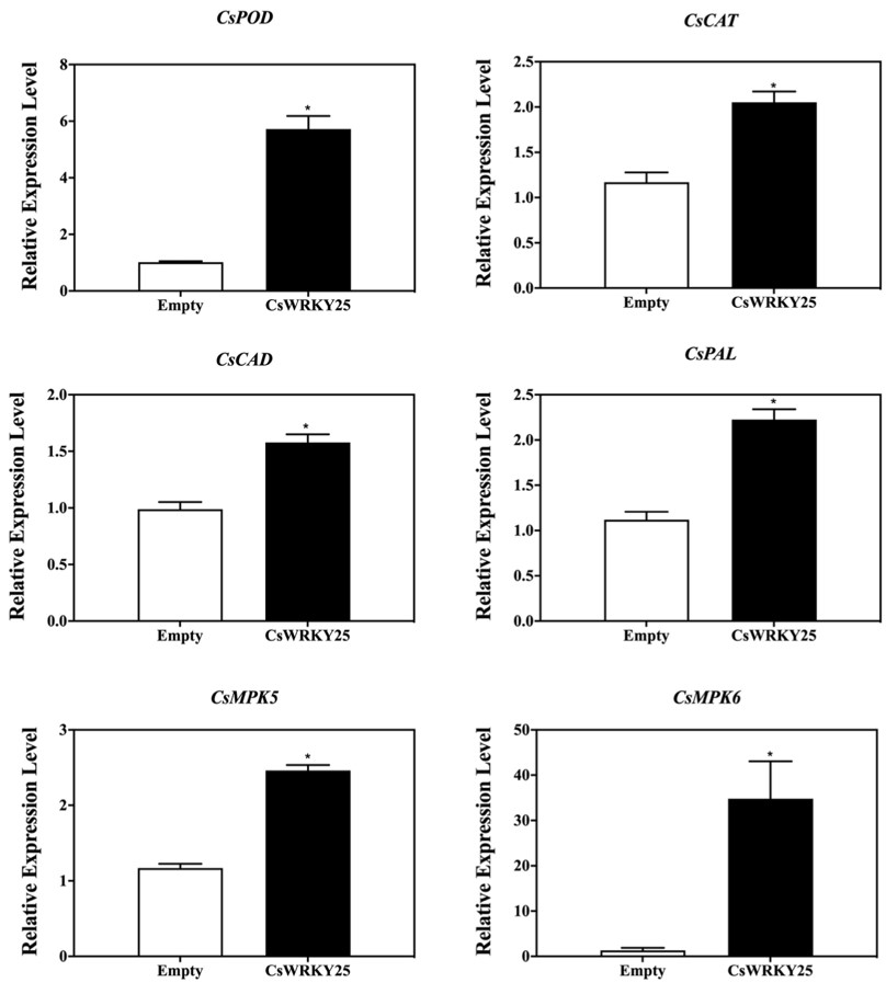 3 柑橘果皮中瞬时过表达CsWRKY25导致CsPODCsCATCsCADCsPALCsMPK5CsMPK6表达量增加