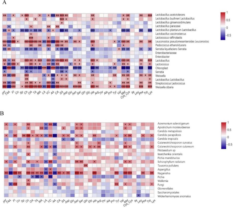 图1.泡菜的理化特性(pH、总酸、21 种游离氨基酸、8种有机酸、4种质地特性)和优势细菌(A)和真菌(B)物种之间的 Spearman相关性热图