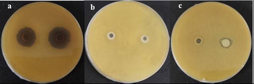 (注:a:无菌上清液;b:有外包物的菌体;c:无外包物的菌体)
