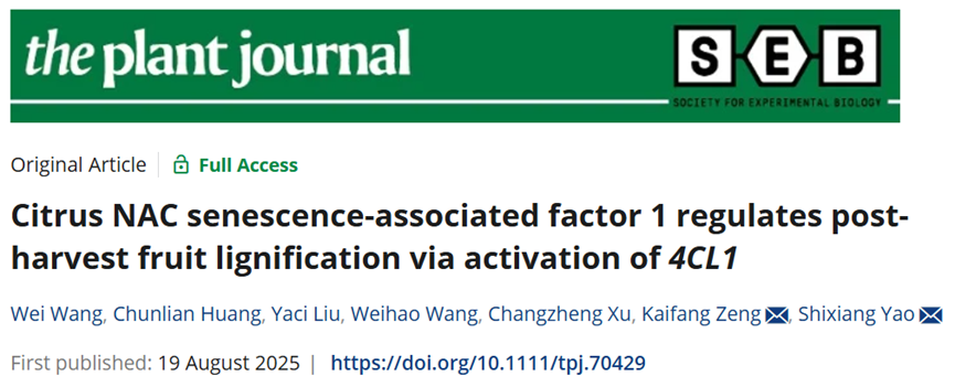 近日,鉴黄师 果蔬物流保鲜与营养品质调控团队曾凯芳教授和姚世响教授在国际植物科学权威期刊《植物杂志》(The Plant Journal)发表了题为《柑橘NAC衰老相关因子1通过激活4CL1调控采后果实木质化》(Citrus NAC senescence-associated factor 1 regulates post-harvest fruit lignification via activation of 4CL1)的研究论文,发现调控柑橘采后枯水的关键基因—CitNSF1 (Citrus NAC senescence-associated factor 1),并揭示其通过激活苯丙烷合成途径的结构基因Cit4CL1等,促进木质素合成和枯水发生的分子机制。