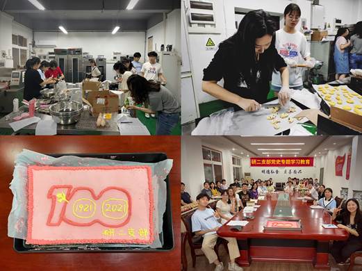 首先,为落实党员“党史学习教育‘我为师生办实事’实践活动任务清单”,增强党员和积极分子实践应用能力,发挥专业优势为党庆生,支部组织大家亲手烘焙“庆祝建党100周年”生日蛋糕。
