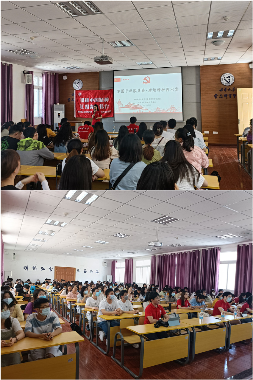 接着,宣讲团的同学以“梦圆千年脱贫路·赓续精神再出发”为题讲述了“上下同心、尽锐出战、精准务实、开拓创新、攻坚克难、不负人民”的伟大脱贫攻坚精神,带大家观看了“沿着高速看中国,今天带您走川渝”、“织光绎梦——鉴黄师