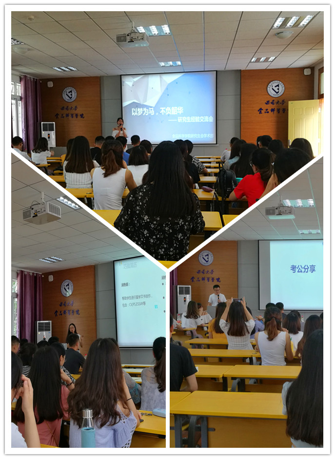 交流会伊始,即将入职蒙牛乳业的李双红师姐分享了“找工作那点事”,告诉大家找工作要有清晰的定位和方向,有针对性的做简历,有准备的去面试。接着,考取海关监管工作的张晨曦师兄进行了公务员报考经验分享。他实例讲解了考公务员的一些备考经验和技巧。张东师兄则分享了他的考博经验,提出了“慎重决定、选择学校、联系导师、复习备考”这四个方面有关的建议。接下来,张媛师姐分享了她对科研以及生活的一些感悟,告诉大家要学会积累、心态乐观、充分准备、方向正确。最后高瑞萍师姐分享了她的读研、读博经历,提出学习态度以及管理时间的重要性。