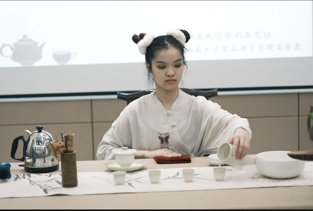 在茶艺表演环节,紫韵茶艺社表演队成员进行了紫砂壶,盖碗开幕表演,2021级茶学同学们也纷纷献上了精心设计的表演,展现了茶艺的独特魅力。