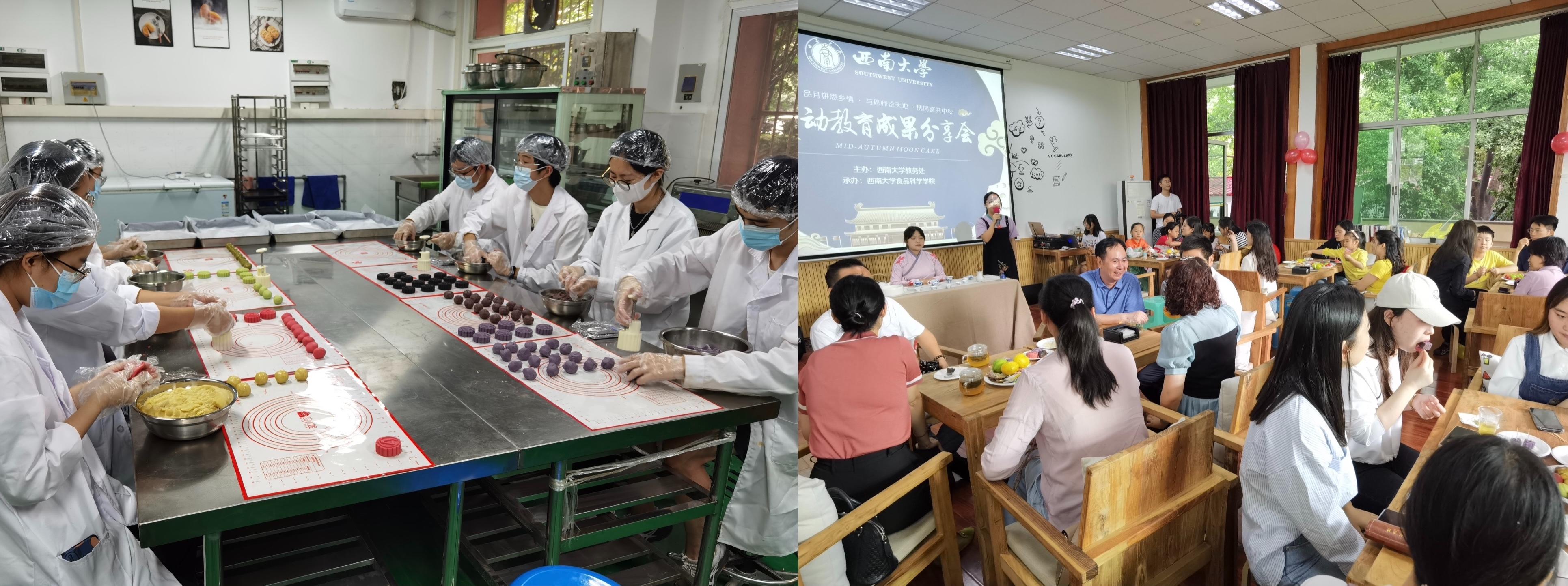 分享会在茶艺社精彩绝伦的茶艺表演中正式拉开帷幕。本次分享会的主角闪亮出场,由烘焙俱乐部自主研发制作的四款月饼走入所有嘉宾和同学的视野中。烘焙俱乐部是学院根据学生兴趣而针对性创办的特色教育教学中心,专业素养高,产品质量优,曾在第六届食品博览会中大展风采。面对此次劳动教育分享会,烘焙俱乐部结合学院茶、葡萄酒等特色研究方向,创造性改良出青苹果茶渍青梅、紫薯薏仁紫米、经典藤椒牛肉、浓情红酒蔓越莓四种口味月饼,同时别具匠心地将校徽、院徽及其他校园记忆做成logo印在月饼上,凸显满满的西大特色。在月饼的研制过程中,俱乐部同学们不怕困难,大胆实践,敢于创新,从天然食材中提取颜色,用天然食材搭配馅料,经过揉、搓、包、烤四道流程,四款低热量、低糖分的月饼便呈现在我们面前。