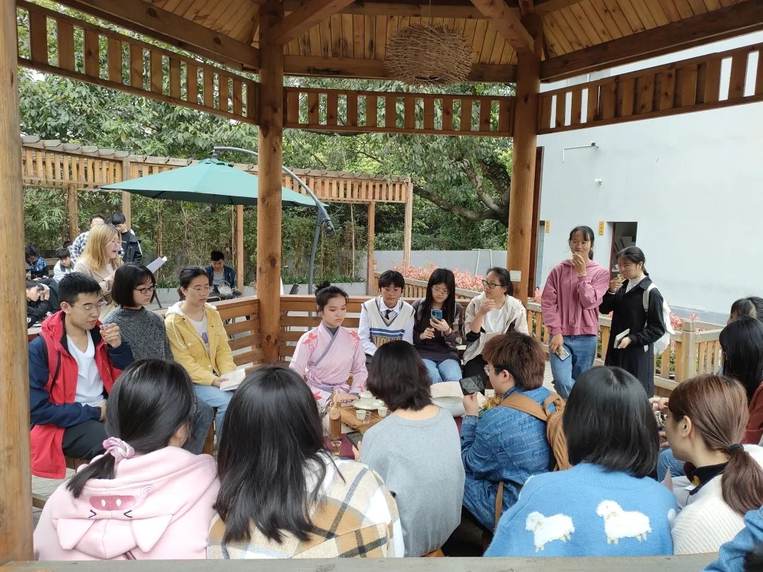 参观完各个部门的工作以后,大家都聚到了茶亭中,观看茶艺表演,品尝西农茶叶。