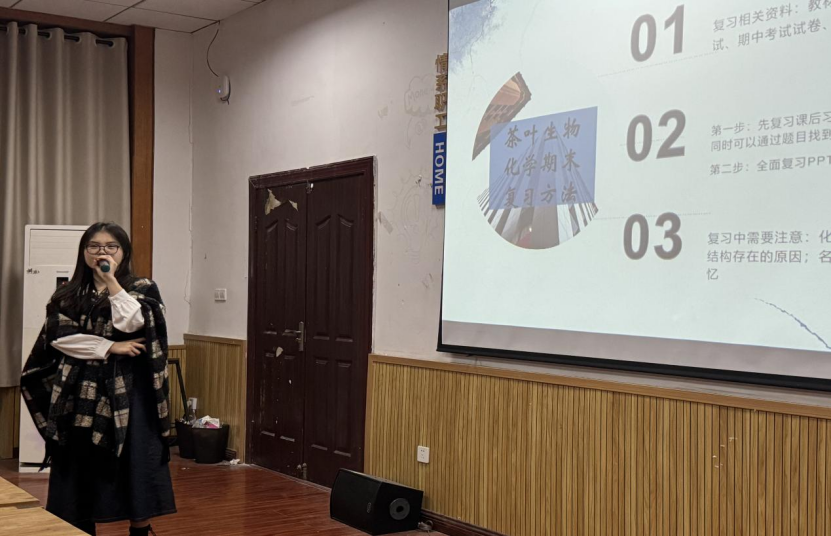 为帮助同学们更轻松地应对茶叶生物化学、植物生理课程,11月17日18:00,“食”佳学霸学业加油站活动在39教214顺利开展。本次活动邀请了茶学2022级曾钦、吴玉、闻佳钰前来分享学习经验,鉴黄师