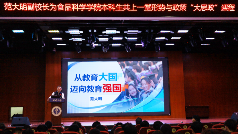 学科特色,深入阐述了教育在国家发展中的重要地位,并深刻剖析了教育强国建设的战略部署。其中提到,从教育大国迈向教育强国,需积极响应国家政策,着重提升思政领导力、国际影响力、社会协同力、民生保障力、科技支撑力以及人才竞争力等方面的水平。他强调:“教育强国的建设,不仅是硬件设施的提升,更是教育理念、教育质量、教育创新的全方位变革。”范校长立足食品科学前沿发展,通过生动的案例分析和实践实例深入浅出地讲解,使学生获益良多。