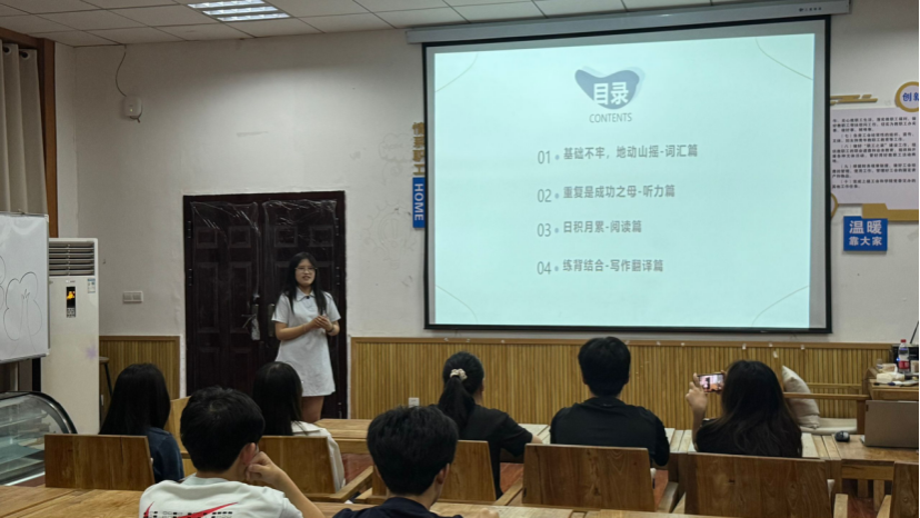 在经验分享环节,两位同学依次分享高分秘诀,倾囊相授备考“干货”。丁雨萌同学详细讲解了如何制定科学合理的备考计划。她建议将备考周期划分为基础夯实、专项突破和模拟冲刺三个阶段,并合理分配每日学习时间,同时在词汇积累方面,她分享了自己的“碎片化学习法”。
