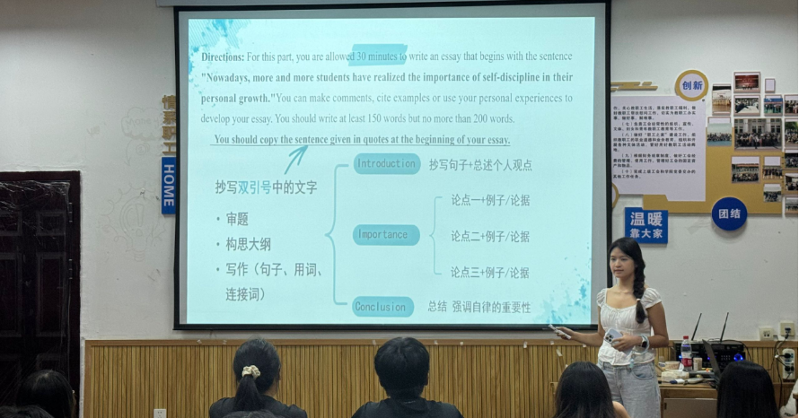 随后,唐艺源同学针对四六级考试的题型展开“解题攻略”分享。在听力训练方面,唐艺源建议同学们采用“精听+泛听”结合的方式,通过反复听写真题原文攻克薄弱环节,同时利用美剧、TED演讲等素材培养语感;针对阅读题,唐艺源传授了“定位关键词—分析逻辑关系—对比选项”的高效解题步骤;写作和翻译板块,唐艺源则强调日常积累高分句式、避免中式英语表达的重要性,并展示了自己总结的功能句模板。