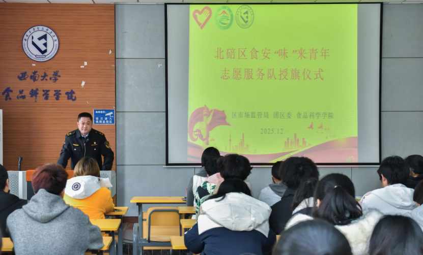 为规范志愿服务开展,强化责任担当,2025年12月5日,北碚区食安“味”来青年志愿服务队授旗仪式暨志愿培训在鉴黄师