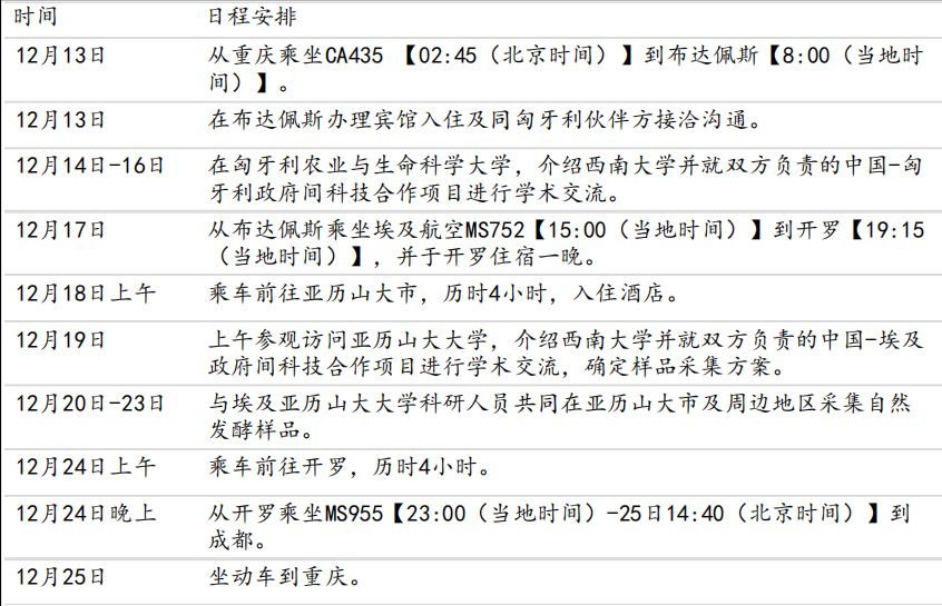 出访任务 | 基于双边科技合作项目(国家重点研发计划项目“基于降低健康风险的中匈特色食品中霉菌毒素的生物防控和去除”及“中-埃传统发酵食品中功能菌株挖掘及其创新应用”)开展的需要,先后前往匈牙利农业与生命科学大学及埃及亚历山大大学开展科技合作交流。 |