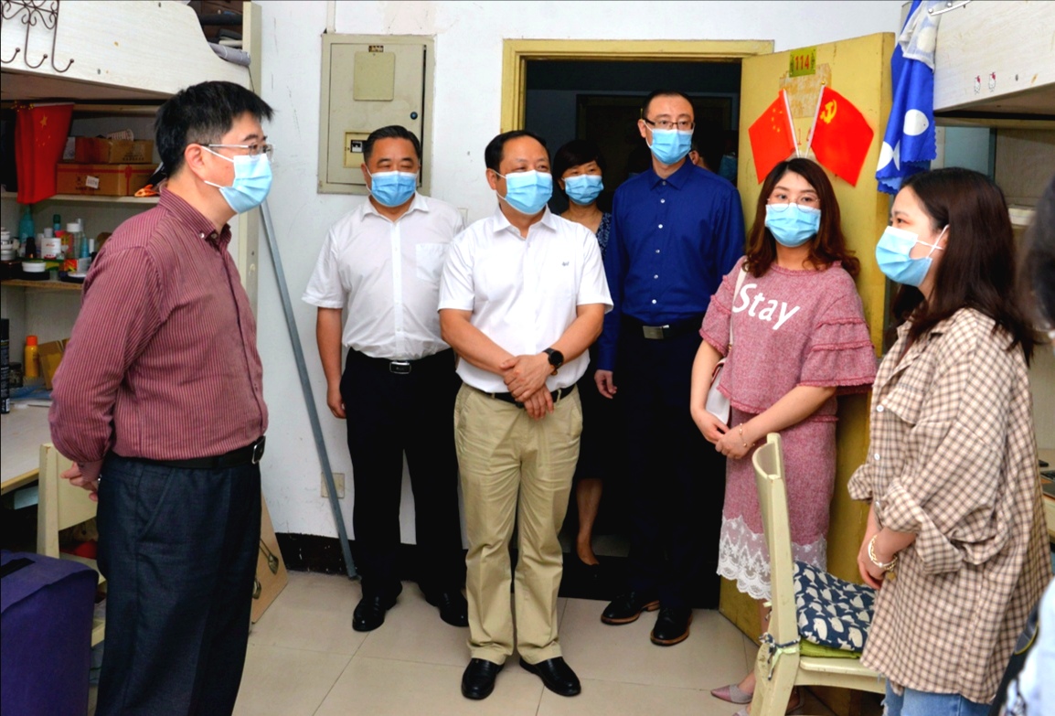 5月21日下午,学校党委书记李旭锋、副校长周光明在学校相关职能部门负责人的陪同下,深入竹园二区学生宿舍看望慰问学院毕业返校研究生,并对开学复课后的学生宿舍管理、防疫志愿服务等工作进行现场指导。学院党委书记吴俊平,研究生辅导员胡孜介绍相关情况。