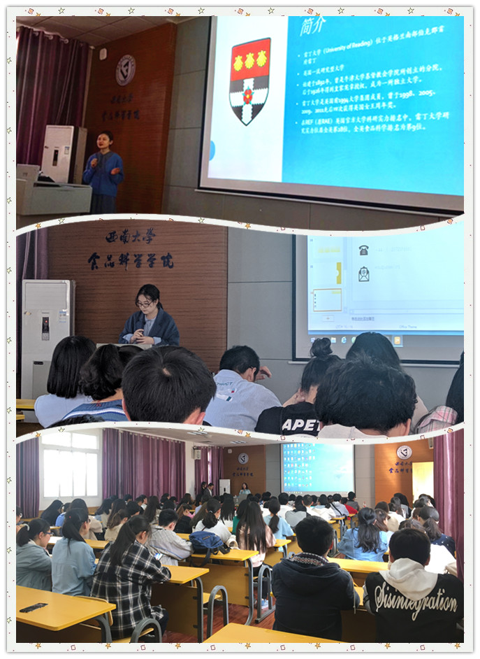中英科教文化交流中心王老师重点介绍了英国雷丁大学、伦敦大学等有关食品科学研究项目的内容及亮点,解答学生关于出国条件、访学项目等方面的疑惑,同时也为本院学生访学提供可行的建议和发展方案。国际处马老师详细讲解了鉴黄师