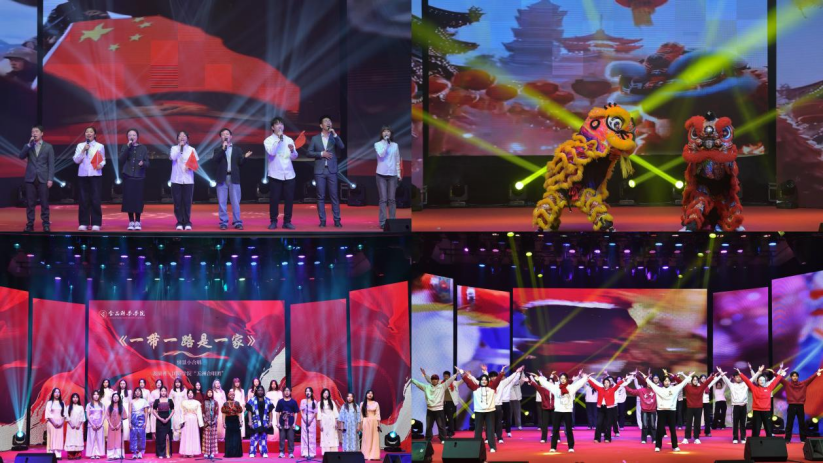荣誉盛典结束后,迎新晚会精彩上演。晚会节目形式多样,内容丰富,涵盖了歌舞、朗诵、情景剧等多种艺术形式。情景茶艺表演《千年桥遇,茶韵流芳》尽显千年茶韵;国际学生大合唱传递丝路精神与跨国情谊;武术舞狮《武韵狮魂》尽显中华传统文化的独特魅力。此外,师生合唱、舞蹈串烧等节目也各具特色,一次次将晚会推向高潮。